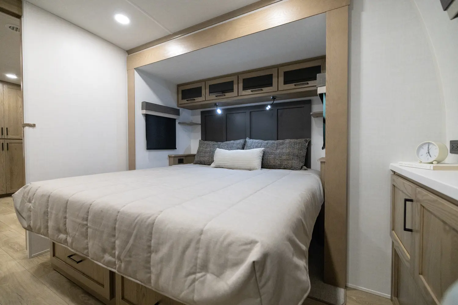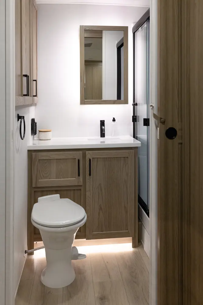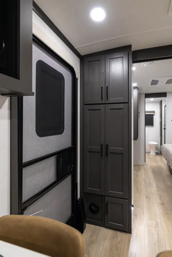 EXQUISITE, EXPANSIVE INTERIORS AS THE NORM. WELCOME TO THE SIGNATURE SERIES, REDEFINING THE CAMPING EXPERIENCE THROUGH AN ARRAY OF REMARKABLE FEATURES. With its inviting open floorplans and ample storage capacity, there's room for those cherished guests or family you wish to bring along. As you nestle into the embrace of a plush king or queen sized bed, the restlessness of your adventures fade away. Through its efficient layout and panoramic windows, the Signature travel trailers offer you an opportunity to luxuriate in your surroundings, all while enjoying the comfort of your serene interior.