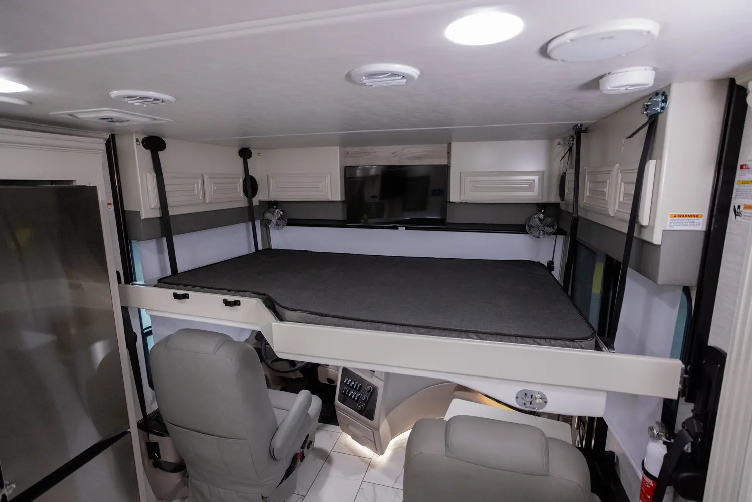The Berkshire XL 40E is a three-slide bunkhouse model with two full bathrooms. The rear full bath includes a shower, vanity sink with medicine cabinet, and stacking washer/dryer. The bedroom has a slideout, 72" x 80" Tilt-a-View king bed, plus a dresser, wardrobe cabinet, TV, and overhead cupboard. The second full bath sits across from the bunk room/wardrobe combo. The kitchen is fully equipped, with a convection microwave, induction cooktop, and residential-style refrigerator.