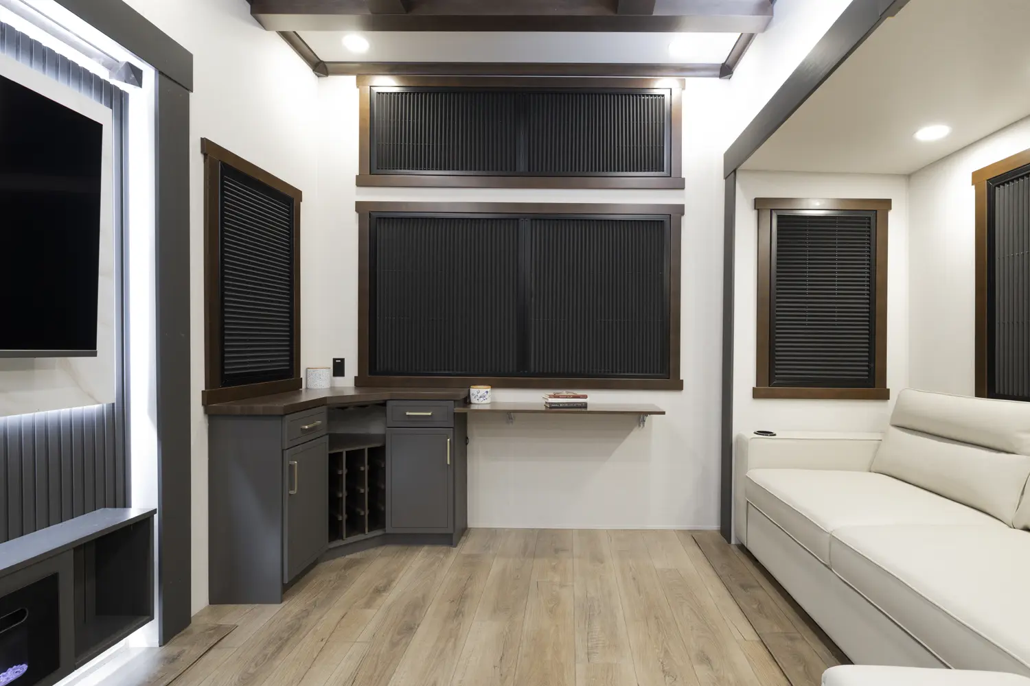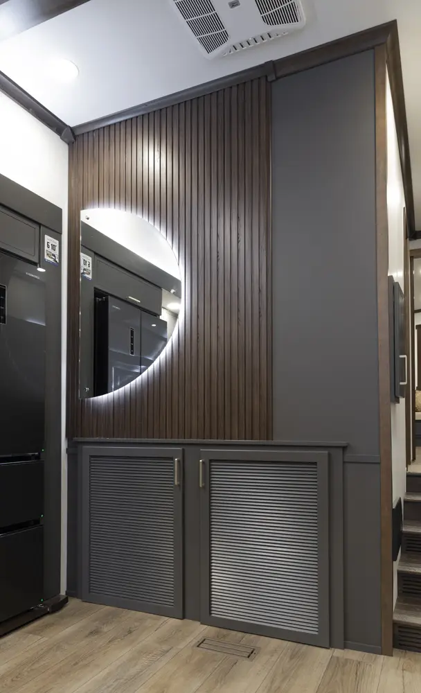 The 412FWC maximizes space with functionality. Step through the massive 38" entrance door and into the mud room, or relax on the L shape sofa and watch TV. This coach also features and area to work with a flip up desk, or an area to entertain with a wine bar. Interior features like custom cabinetry blends with modern amenities like a washer and dryer, adjustable shelves, king bed and more to provide the ultimate stay.