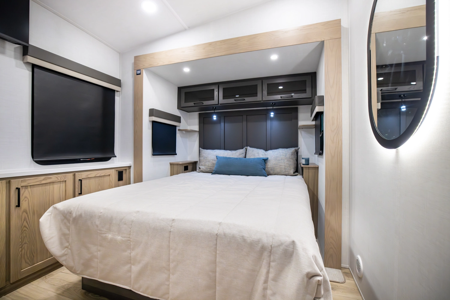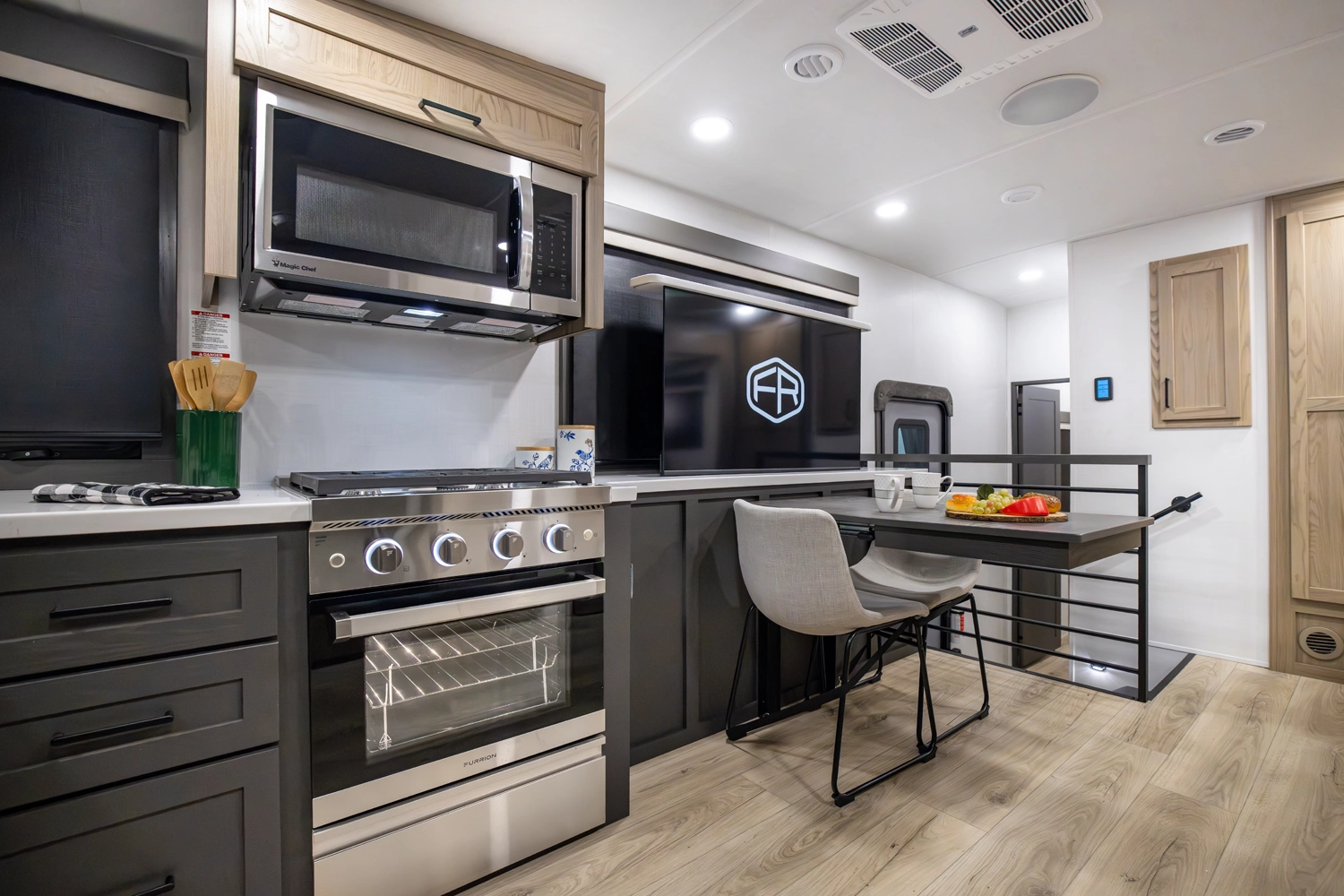 Our first front living fifth wheel under 30' delivers big luxury in a compact design! The front living area features a 60" theater seat, rotating dinette, and televator TV. The kitchen offers a full pantry, fridge, and ample counter space, while the rear bedroom includes a queen bed (king optional), wardrobe, vanity, and washer/dryer prep. With dual awnings and pass-thru storage, it’s perfect for easy towing and upscale comfort.