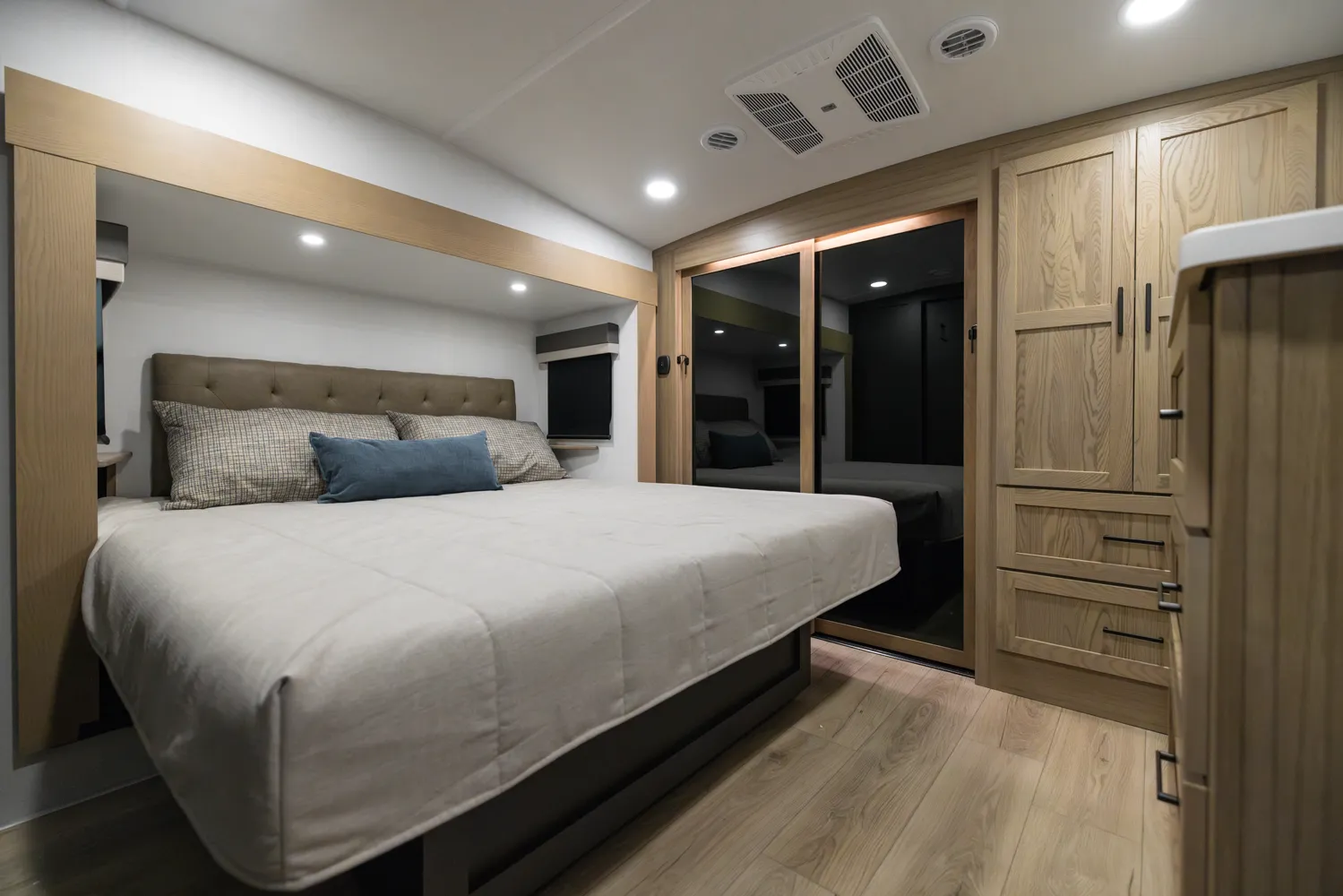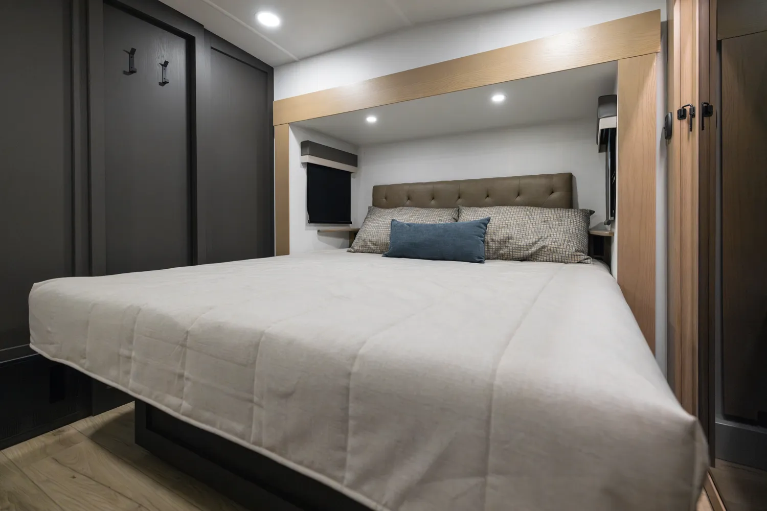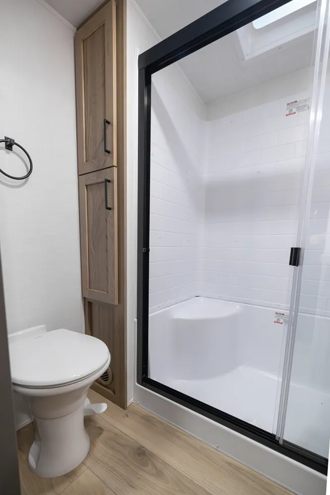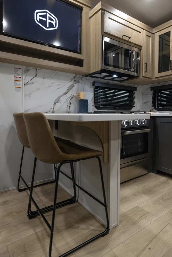 This Fifth Wheel focuses on a large bedroom and bathroom. The bathroom has a 48 x 30” shower with a seat and lots of countertop space with the vanity. The bedroom has a king bed option and storage across the front is vast and accommodating for all your needs. The living area features bar top seating for two and hide-a-bed sofa or theater seat options across from the television. This great lightweight 5th wheel couple’s coach meets so many wants and needs.