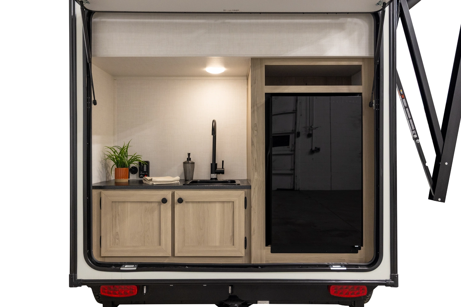 The E-Pro 11LE is an affordable lightweight camper designed for simple, practical camping. Built with aluminum framing and vacuum bonded walls and roof, it delivers durability without adding unnecessary weight. Inside, the massive 54" x 91" U-shaped dinette converts into a spacious sleeping area, while two interior bunks provide additional sleeping space. A convenient rear outdoor kitchen makes cooking at the campsite simple and easy.