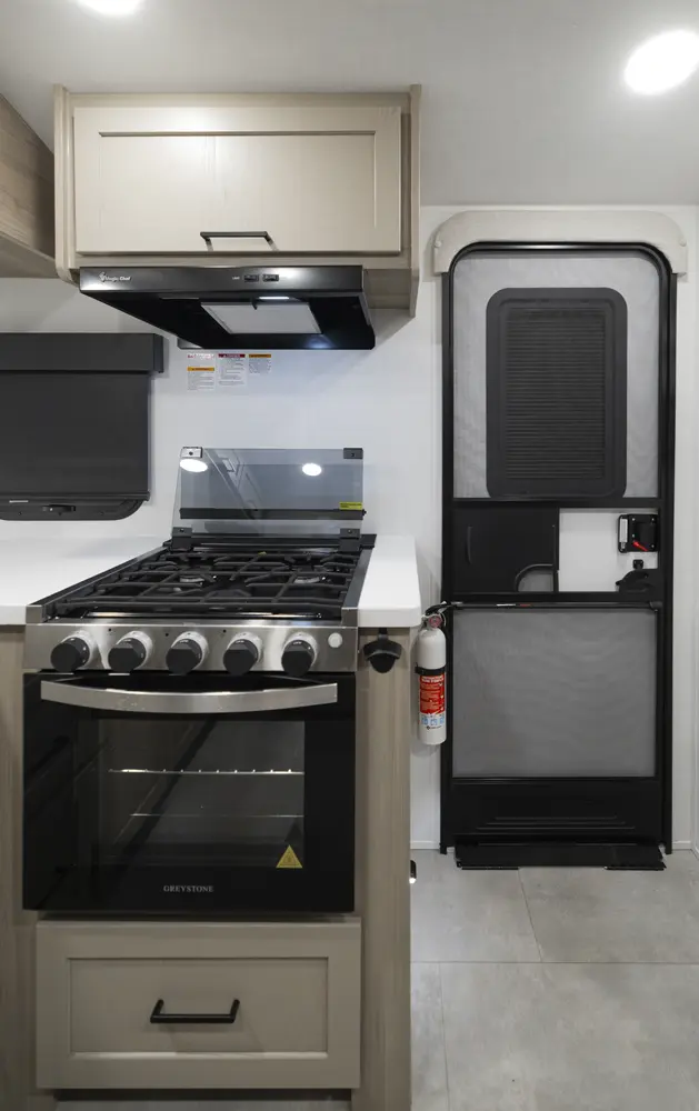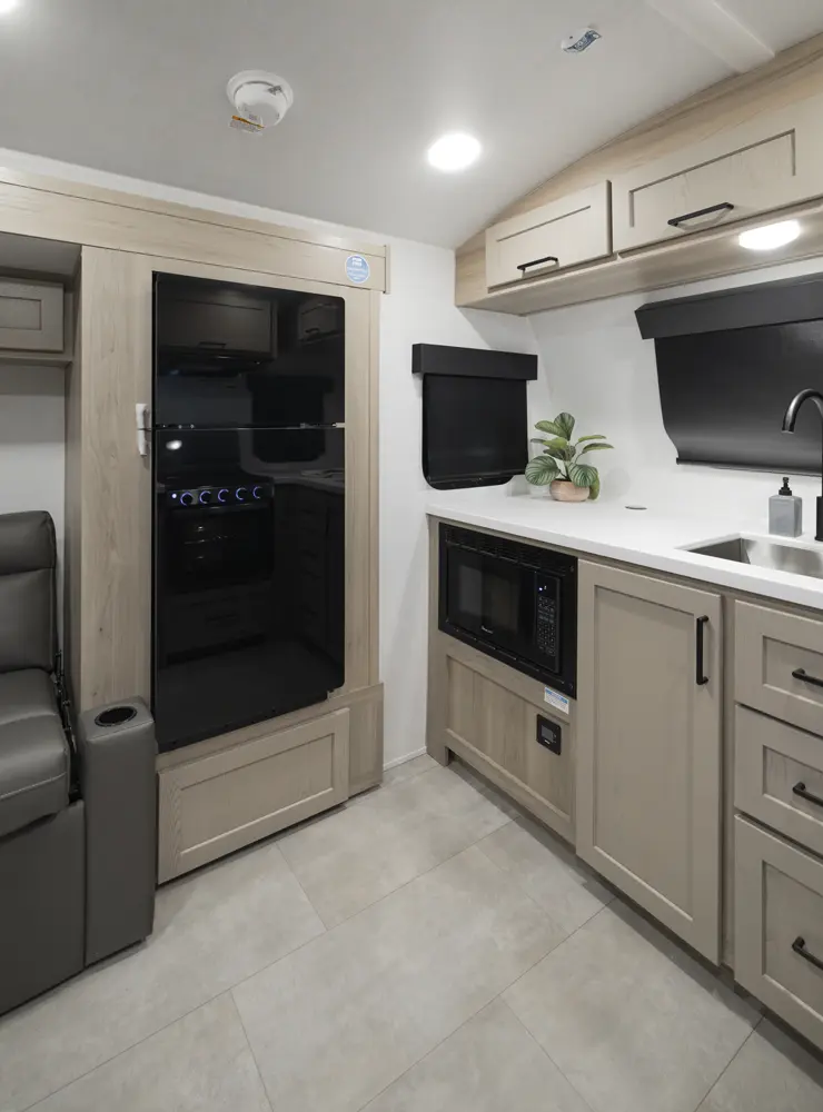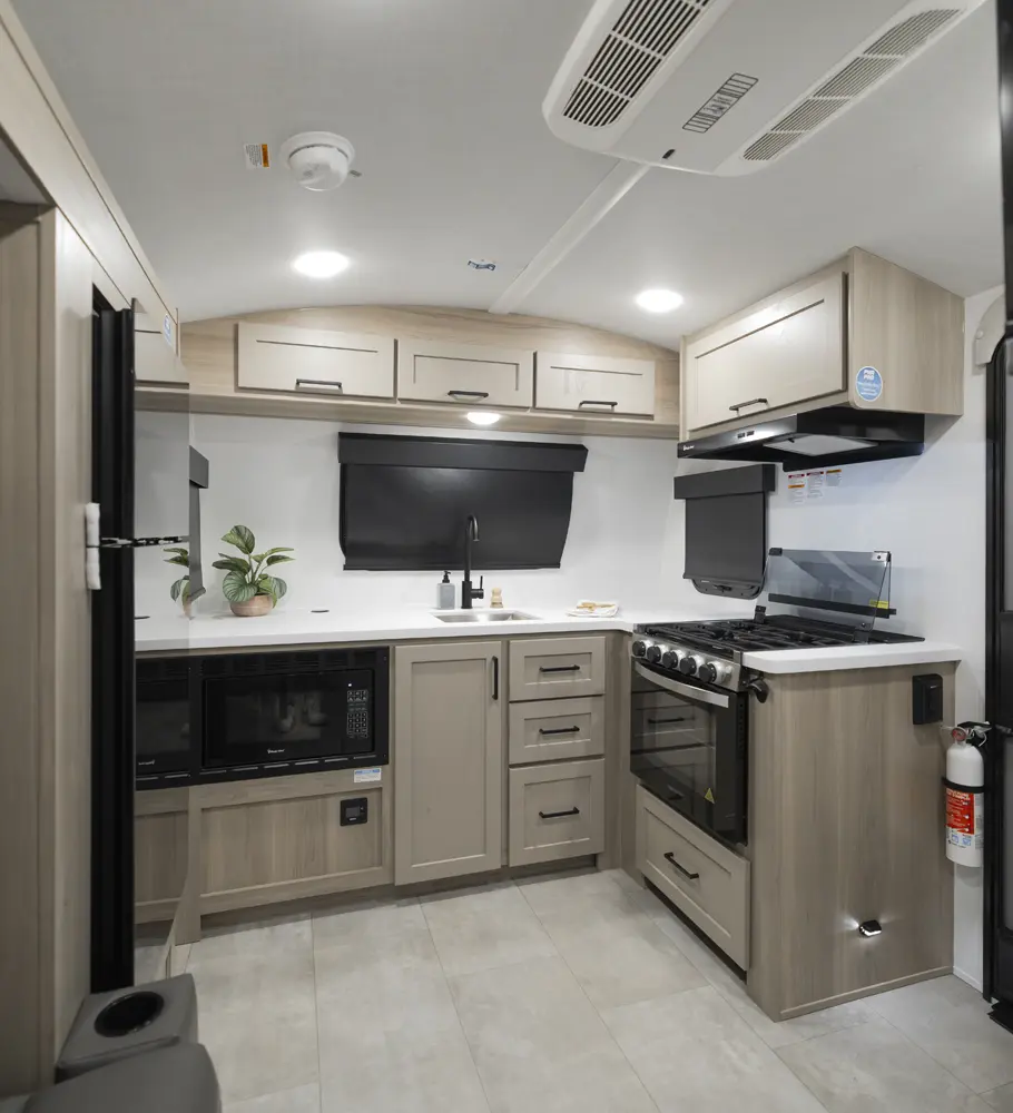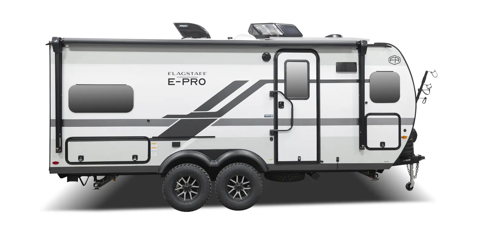 The 20FK is a compact trailer packed with big features! Our first dual axle E-Pro gives you improved stability and towing confidence in a lightweight design. The front kitchen offers excellent counter space while the rear sleeping area and slide-out create a comfortable, open living space. At just over 21 feet, and around 4,200 lbs., the 20FK delivers easy towing with the durability and off grid features that Flagstaff is known for.