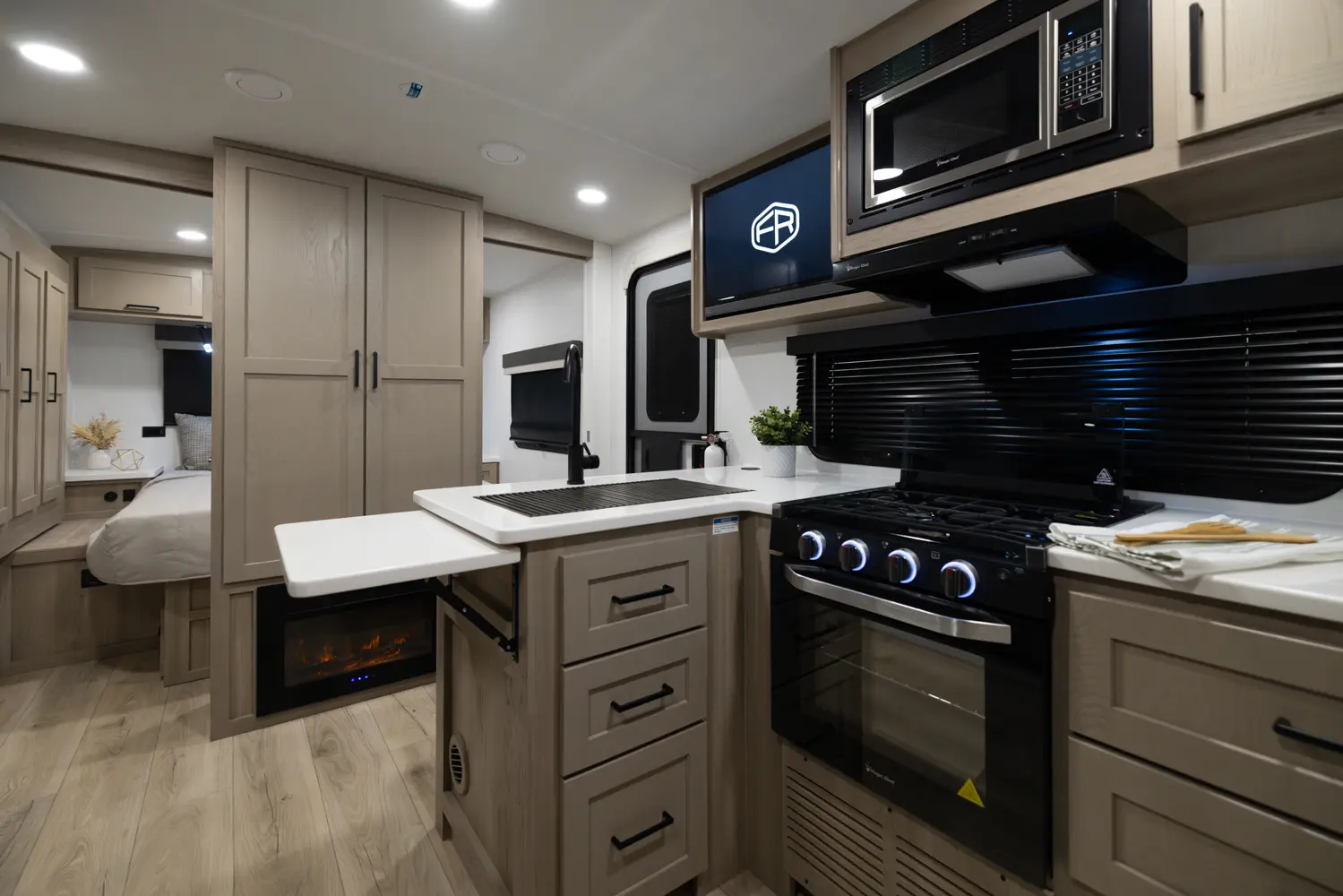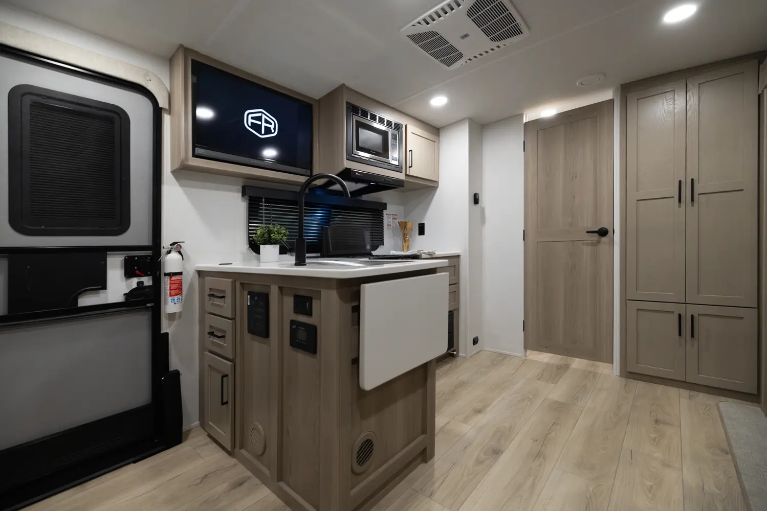 The outside kitchen on this Flagstaff Micro Lite featuring our new griddle, a refrigerator and grill makes cooking so enjoyable and flexible. No need to take the smell of cooking bacon inside. The large wardrobe slide makes packing and organization so easy. The large pantry next to the bathroom covers all your kitchen storage needs as well. The center position of the television in your entertainment spaces makes viewing from any part of the living quarters easy.
