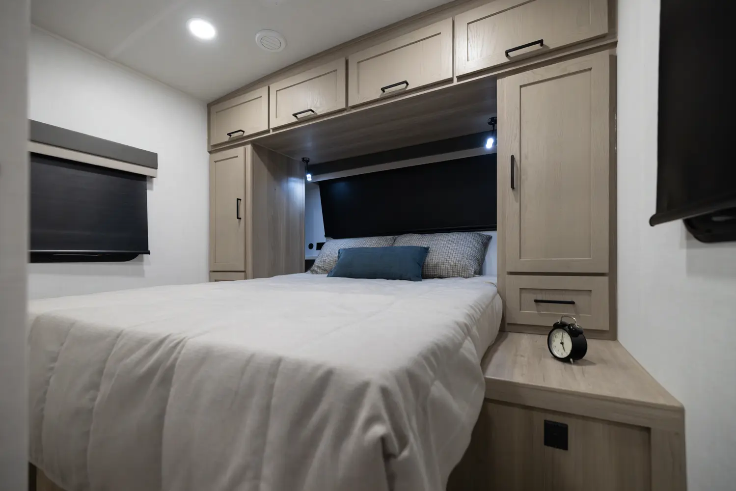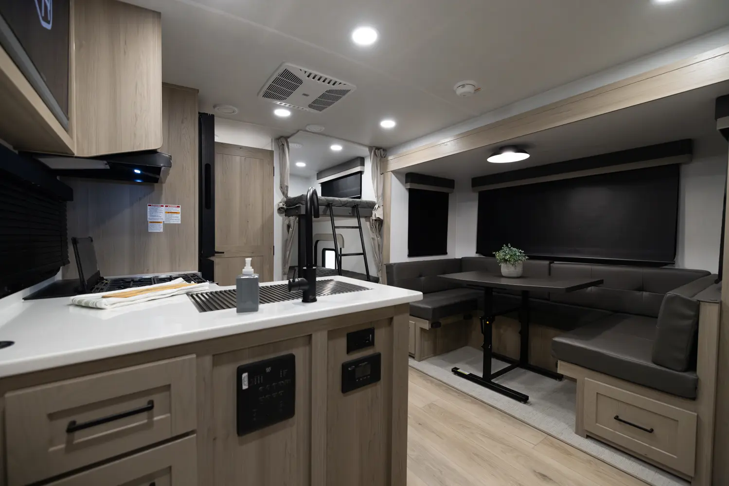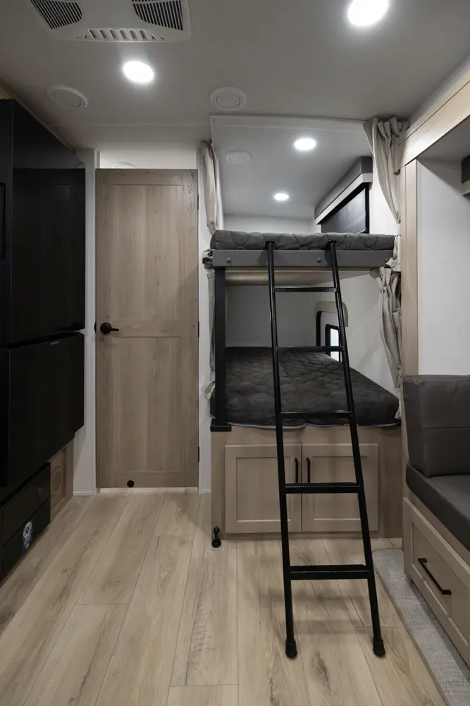 The 25DBH is a bunkhouse layout featuring a segregated front bedroom with a true queen bed and dual wardrobe closets for plenty of personal storage. In the main living area, you'll find a large U-shaped dinette, a spacious kitchen and two 36" x 71" bunks- perfect for kids or guests. This layout blends privacy, comfort, and roominess. An ideal setup for families and groups seeking versatile space on the road.