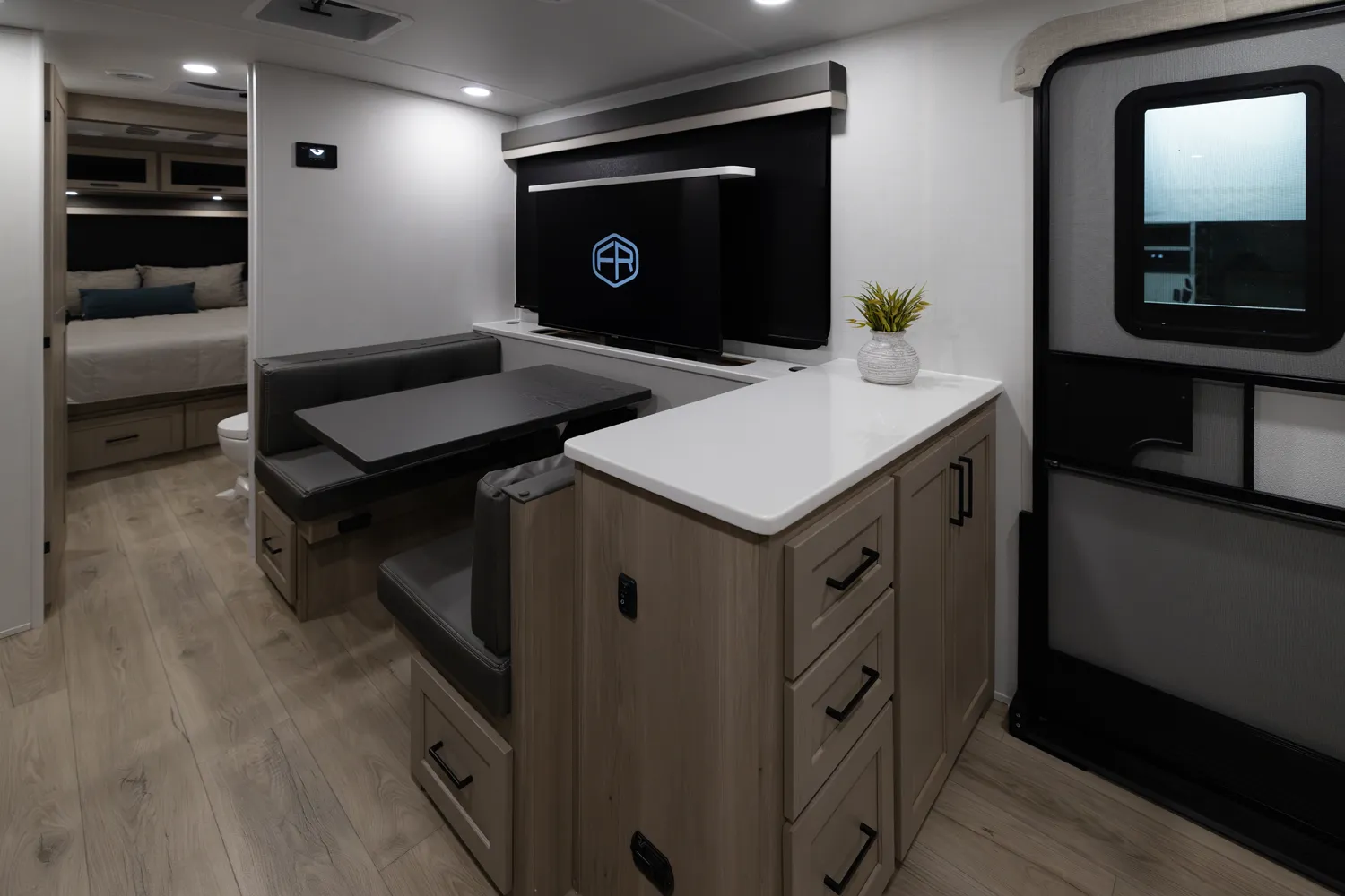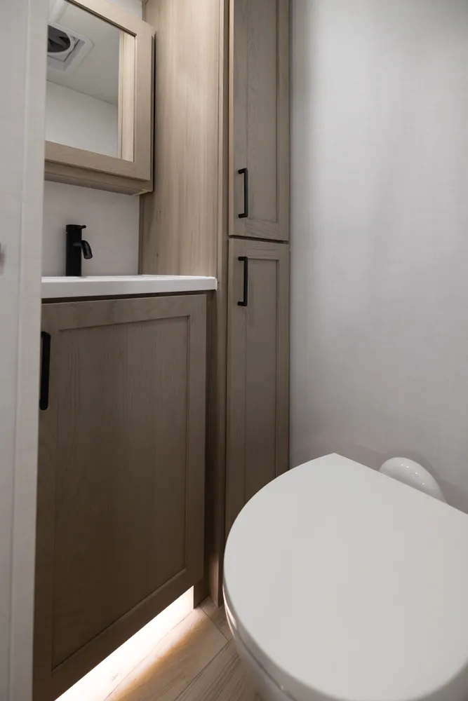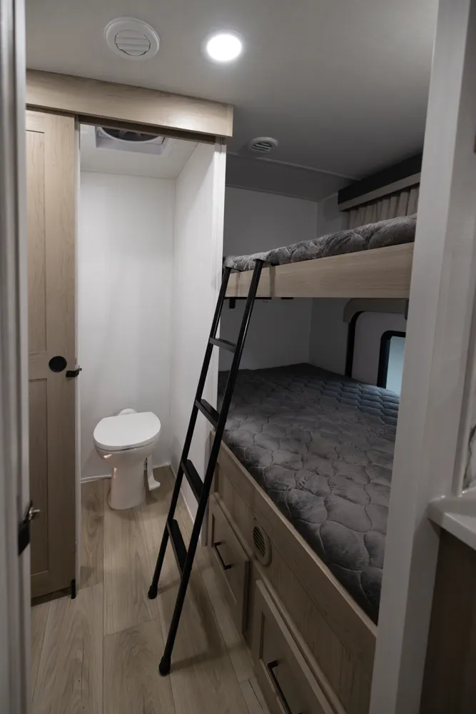The Flagstaff 29DBH features a front bedroom with a true queen bed and a large master bathroom with shower. The spacious living area and kitchen include theater seating and a dinette for comfort and dining. A rear half-bath and segregated bunk room provide privacy and convenience, making the 29DBH ideal for families seeking versatile space and comfort on the road.
