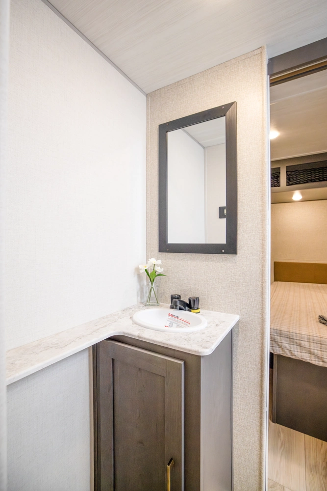 The Ibex New Trail Edition TRAIL28 features a front queen bed, central living area with sofa and dinette, a full kitchen, and a walk-through bath. A private rear bunk room offers four bunks and extra storage. Includes washer/dryer prep, tankless water heater, 50-amp service, and designed with superior construction.