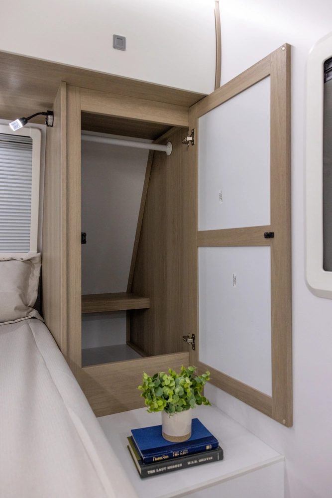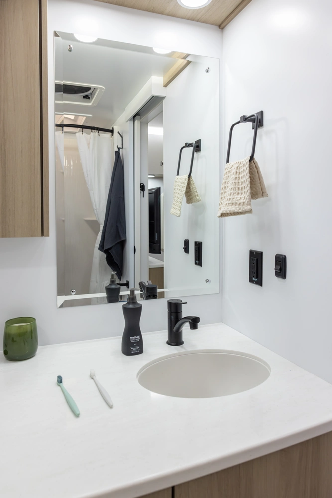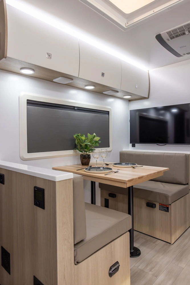 This floorplan provides all necessities without compromising space! It features a full-size queen bed, a 4-person dinette that converts to a bed, and ample bathroom counter space, ensuring comfort for everyone. The oversized passthrough storage compartment offers room for everything you need. Cooking is easy with a 3-burner cooktop, convection microwave oven, a 10.7 cu ft refrigerator, 6 cabinets, and 4 drawers. The robust solar system allows all components to operate without being plugged in.