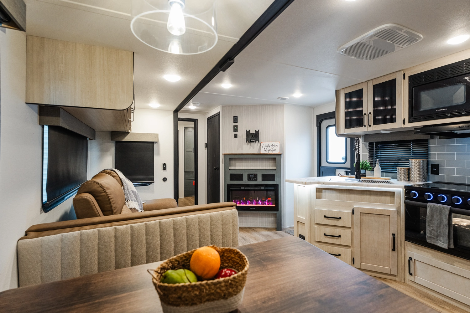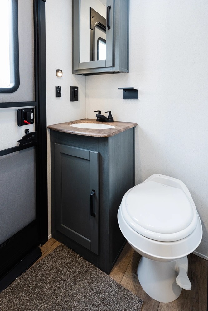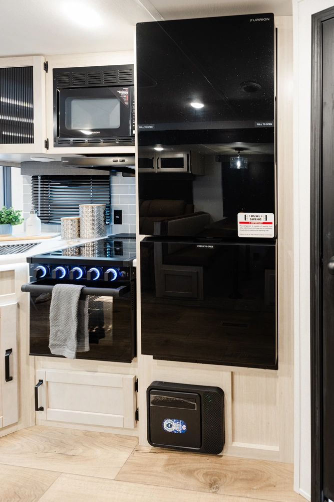 This bunk house travel trailer supplies you a great deal of space in the front bedroom. With a slide out and a large closet for all of your clothes, it will feel like your bedroom at home. The bunk house in the rear provides space for all guests to be comfortable and to make things a cut above, this floor plan provides two bathrooms. Furthermore, the exterior mini camp kitchen features a fridge and a griddle for those of you who like to cook in nature.