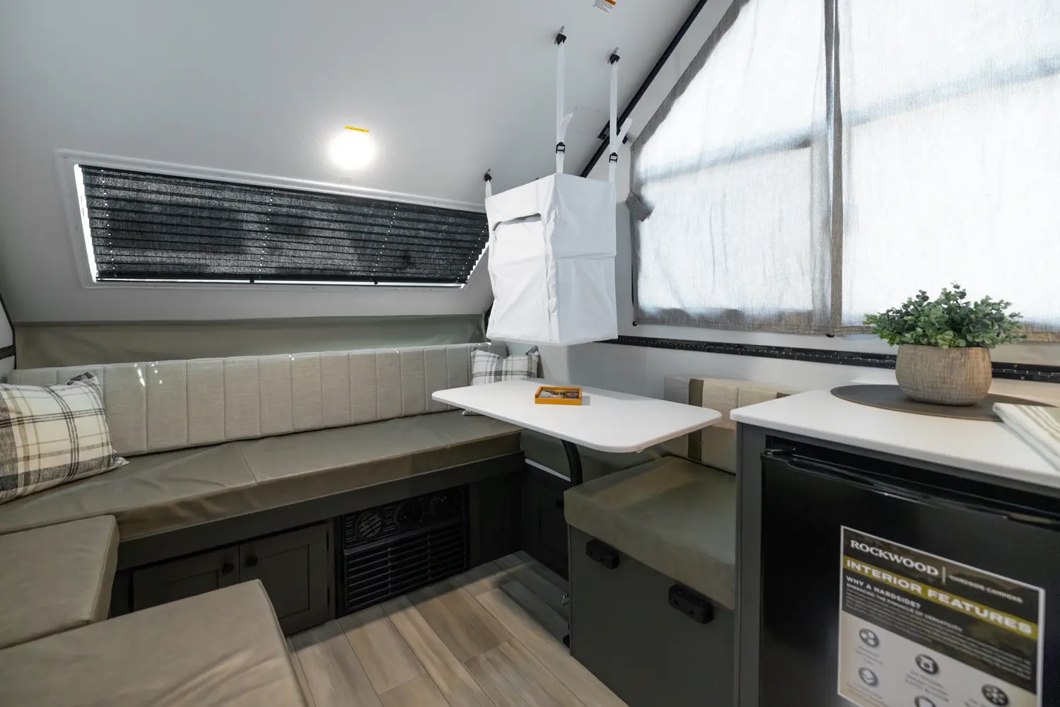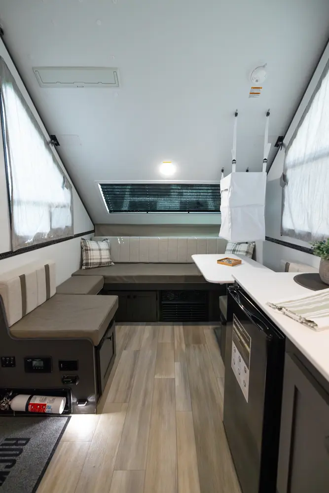 The Rockwood A123RG is a compact A-frame that offers practical comfort for your travels. Inside, you'll find a rear gaucho bed, a cooktop, a small refrigerator, and a wet bath—all designed for efficient use of space. Whether you're on a short trip or an extended adventure, this camper is ready to go with everything you need.