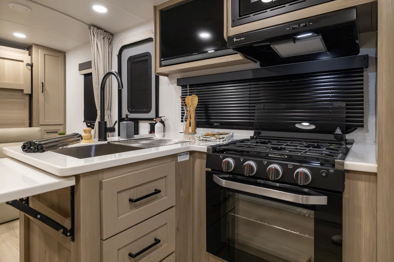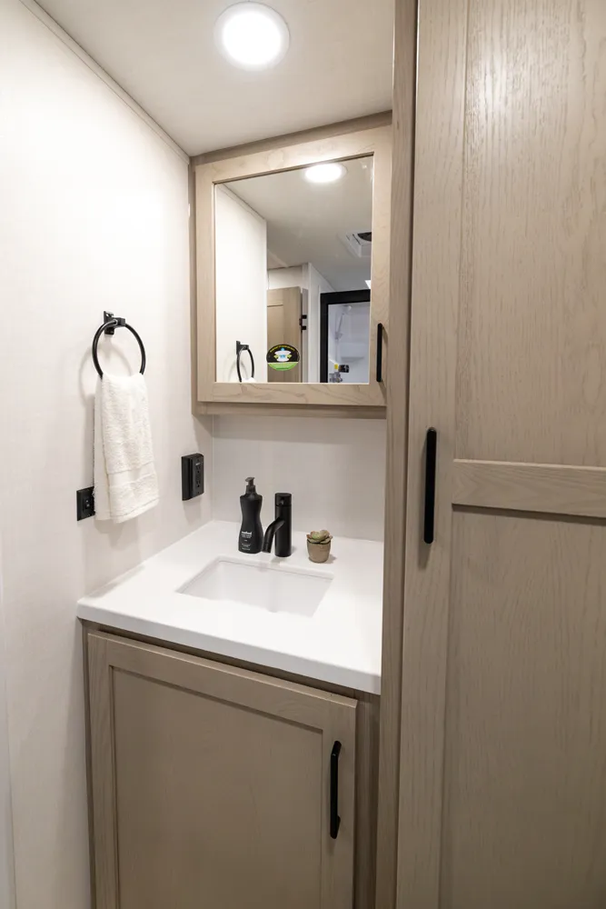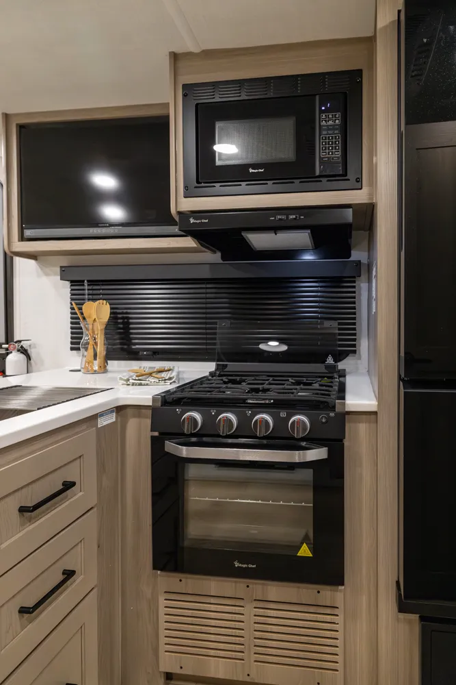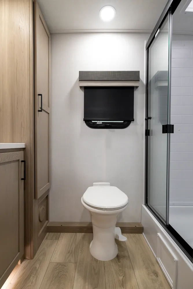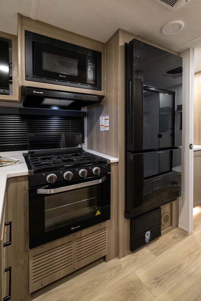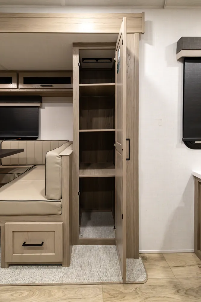 The 2214S delivers a smart, comfortable layout with a front Murphy bed that maximizes living space by day and provides a restful sleep at night. The U-shaped dinette offers plenty of room for meals, games, or extra sleeping space when needed. A large rear bathroom with a rectangular shower adds everyday comfort and convenience making this floor plan a great choice for couples or small families who want big features in a compact trailer.