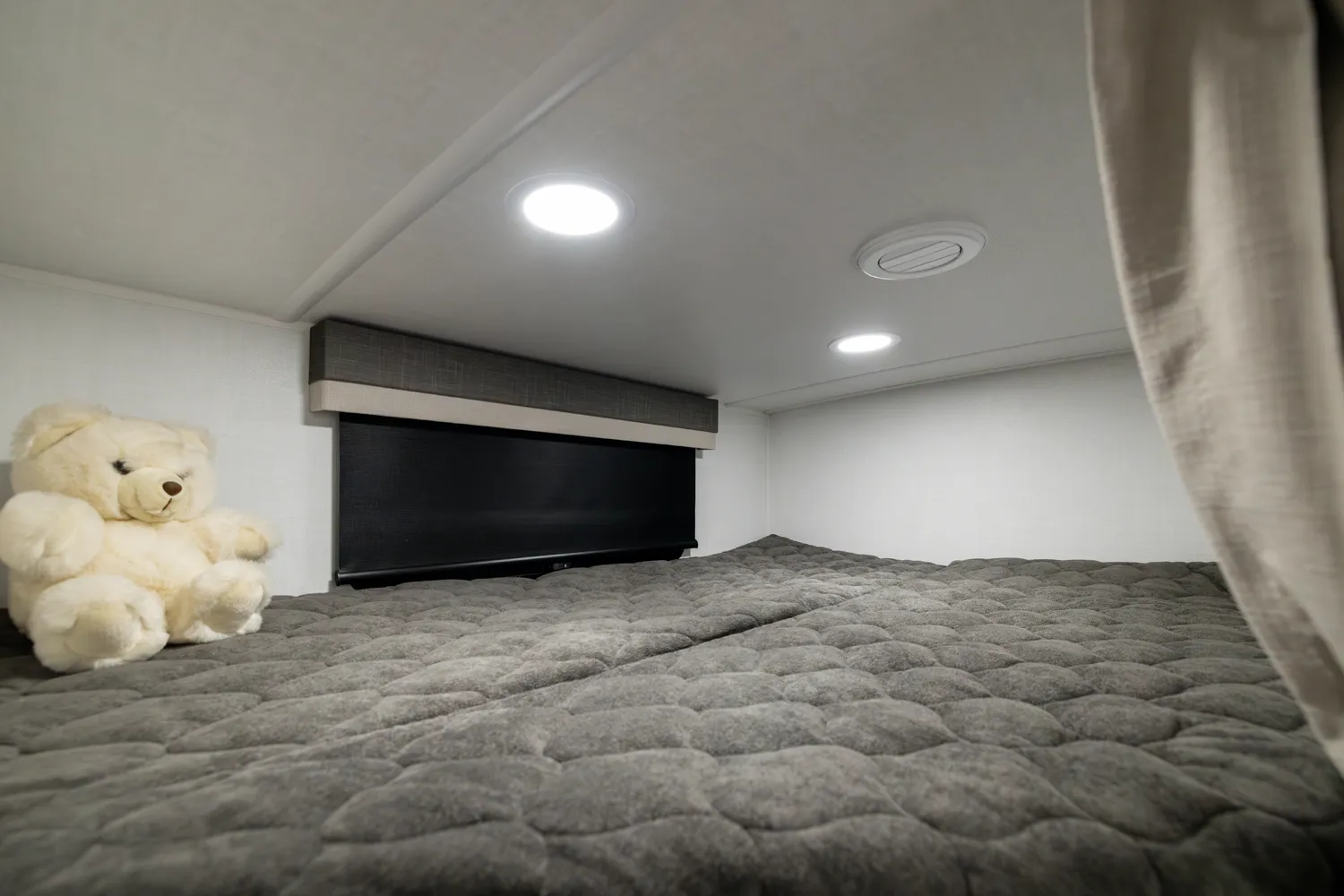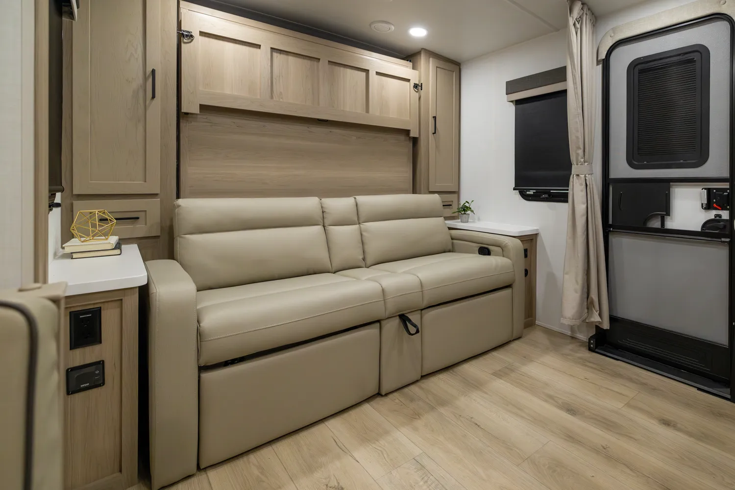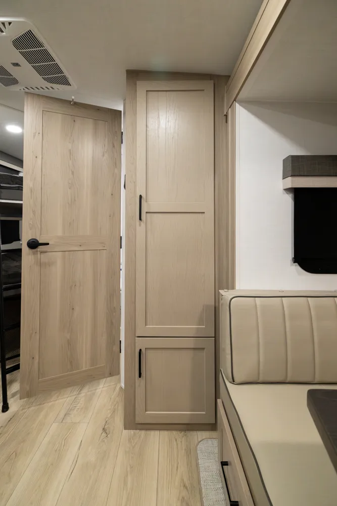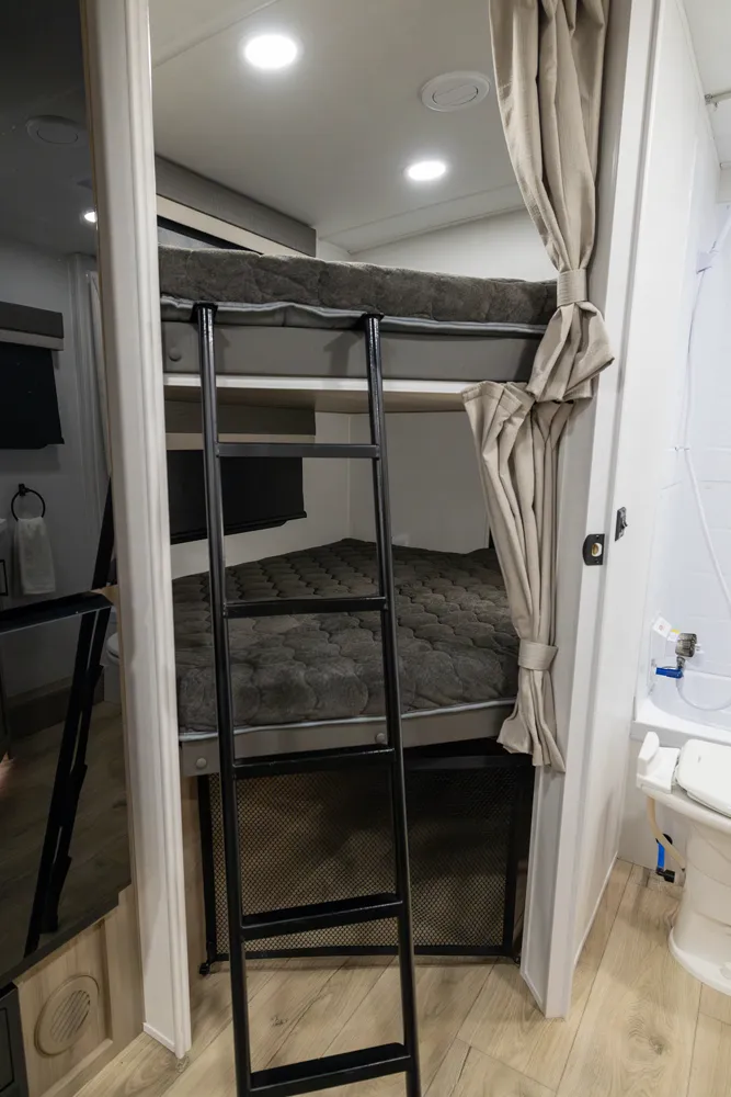 This is the perfect family trailer towing under 26' feet. The double 48" X 72" bunkhouse is awesome for sleeping the kids and even fits adults comfortably. The bottom bunk folds up for even more storage and toys will fit nicely underneath! The big 60" X 74" murphy bed folds up into a sofa for daily use. The giant 18' awning goes almost all the way across your unit while covering the outside kitchen.