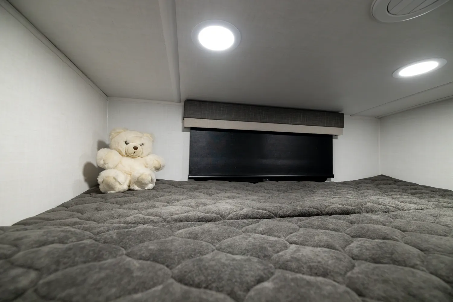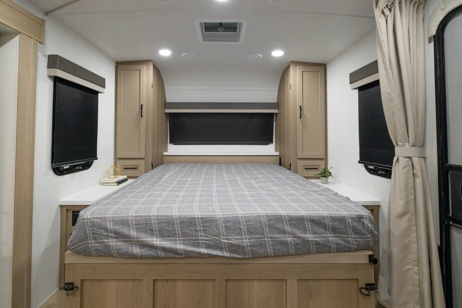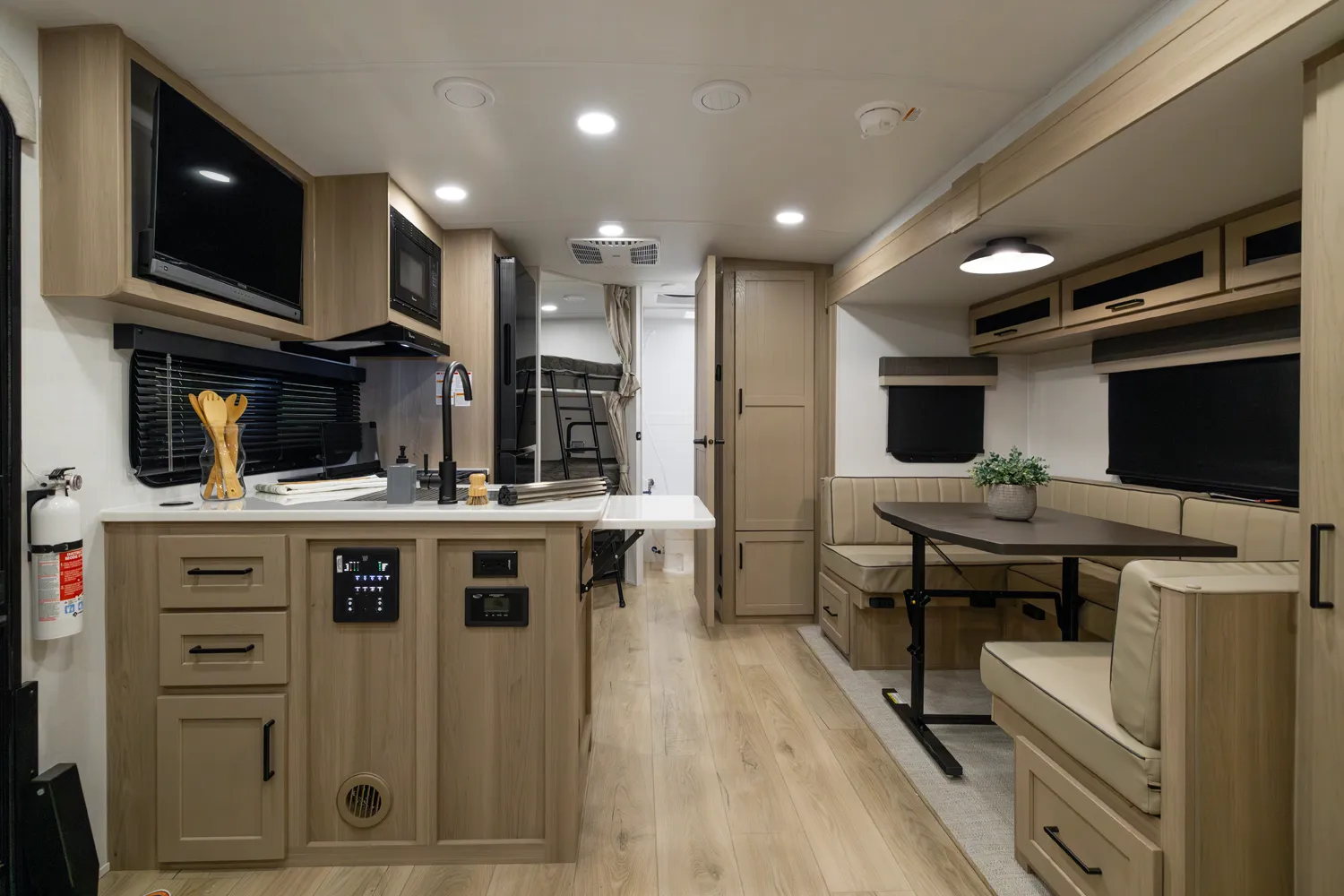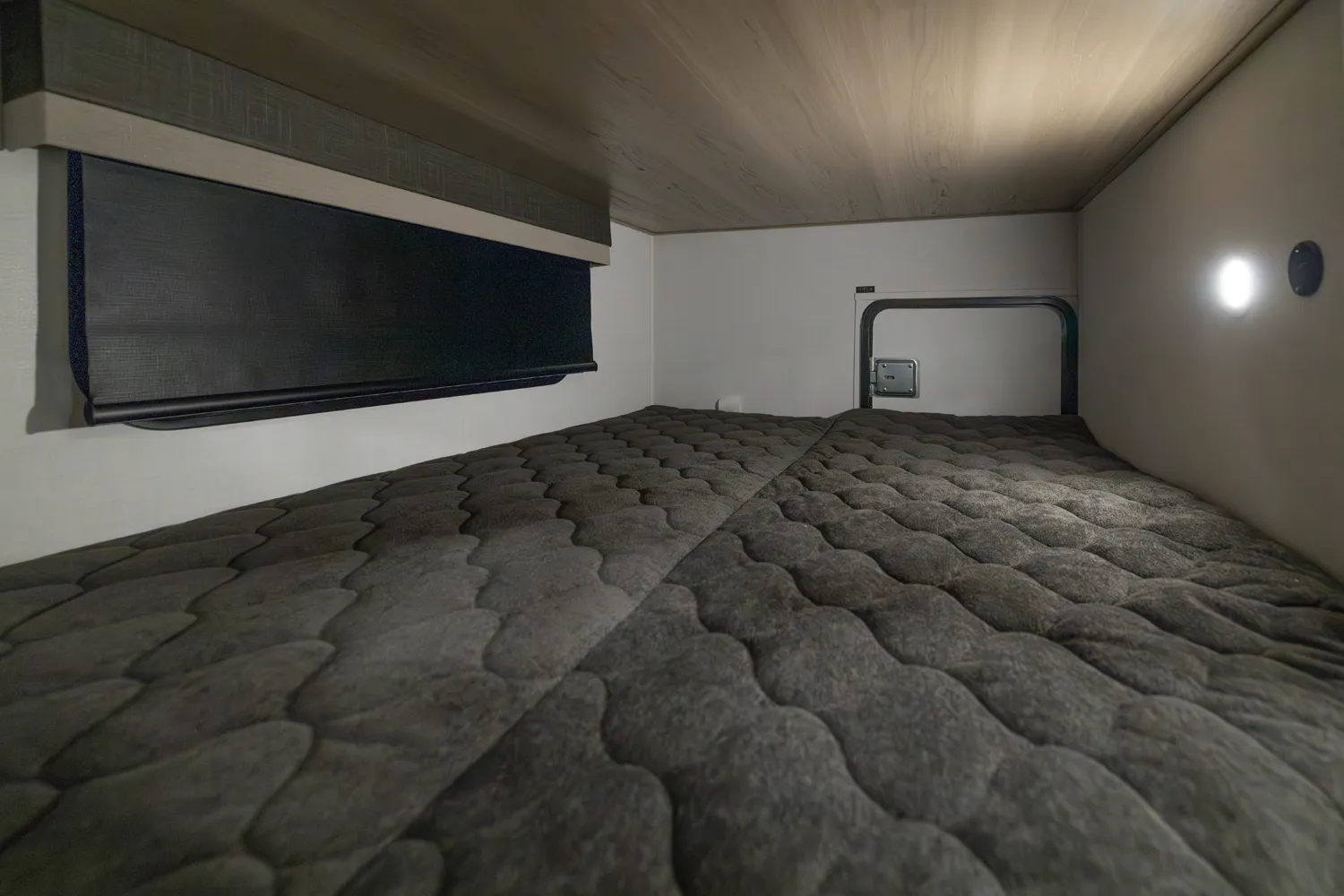 This is the perfect family trailer towing under 26' feet. The double 48" X 72" bunkhouse is awesome for sleeping the kids and even fits adults comfortably. The bottom bunk folds up for even more storage and toys will fit nicely underneath! The big 60" X 74" murphy bed folds up into a sofa for daily use. The giant 18' awning goes almost all the way across your unit while covering the outside kitchen.