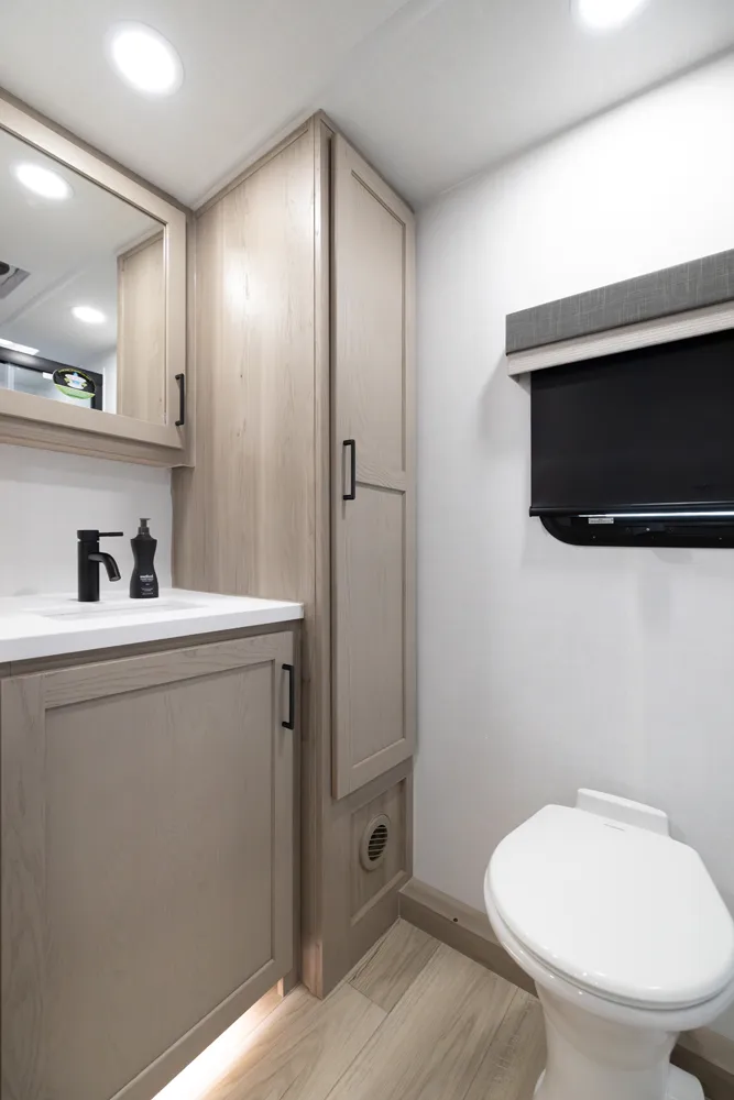 This unit is unique with its big 36" sliding doors leading to the bathroom and bedroom. These doors make moving around for a broad-shouldered person easier and comfortable. The entertainment center is loaded with 32" tv, a residential-style soundbar and a fireplace space heater. Across from this lovely entertainment center is a 72" theatre seating which is perfect for reclining and watching a good movie.