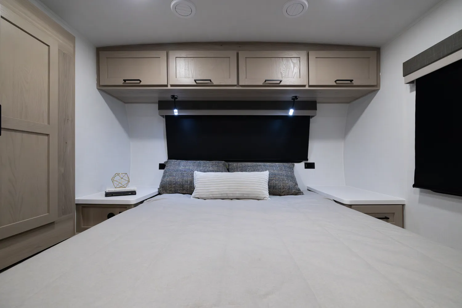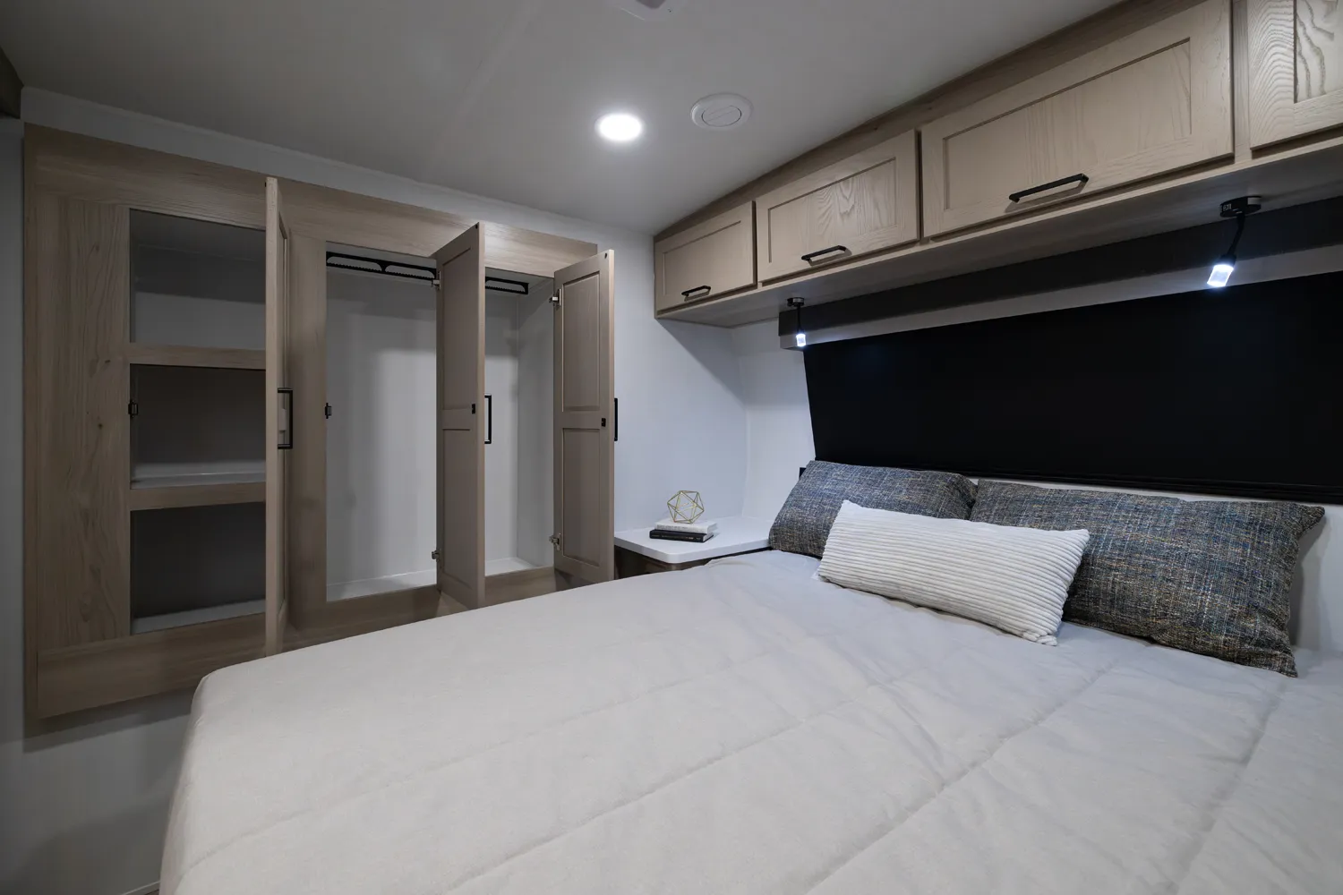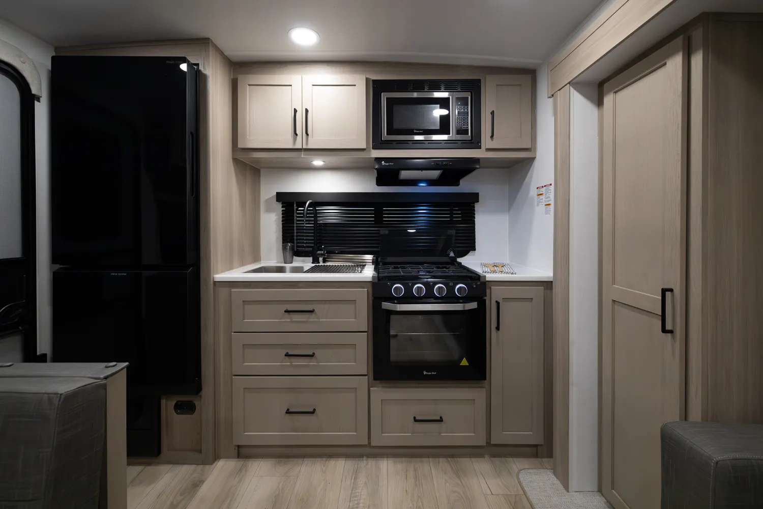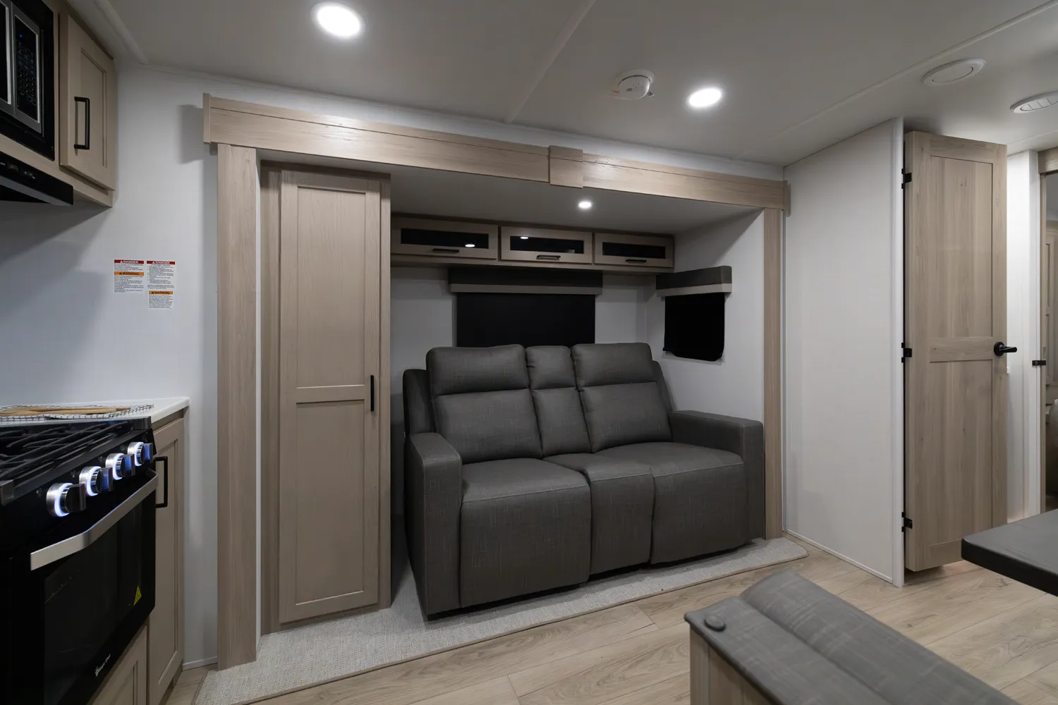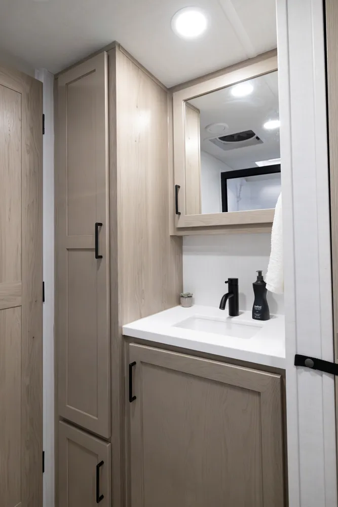 The 2515S offers a spacious convenient layout with two entry doors providing easy access to the kitchen, bedroom, and bathroom, all while the slides are retracted. The rear kitchen features ample counter space while the living area includes a U-shaped dinette and theater seating. (optional hide-a-bed) The wardrobe slide adds generous storage making this a perfect choice for families or couples seeking flexibility and functionality on the road.
