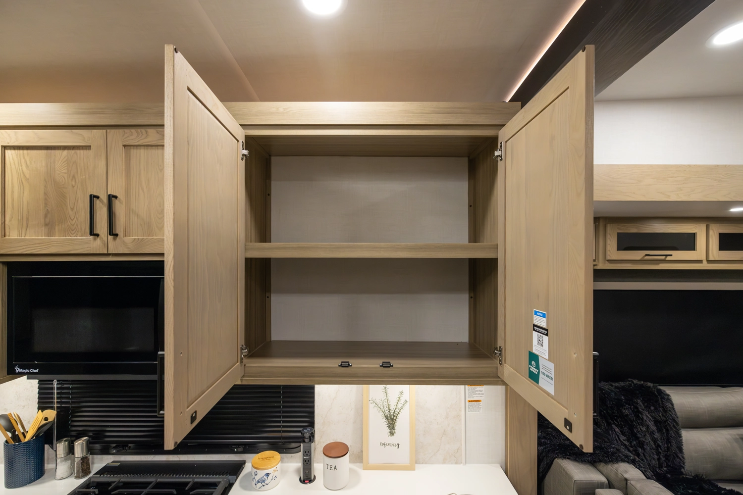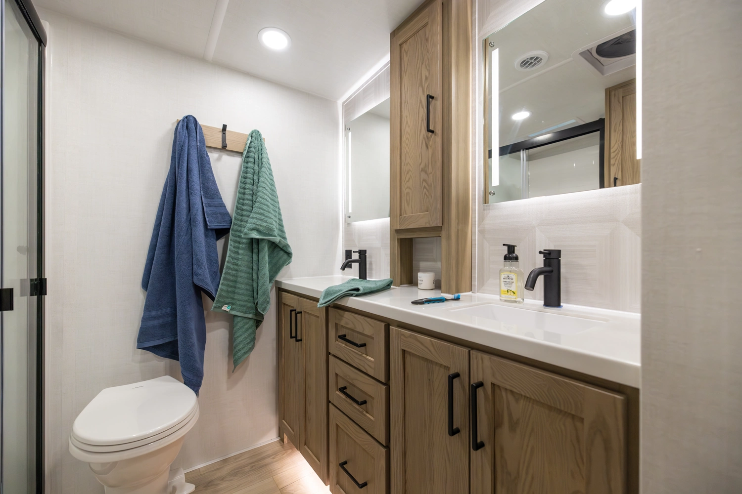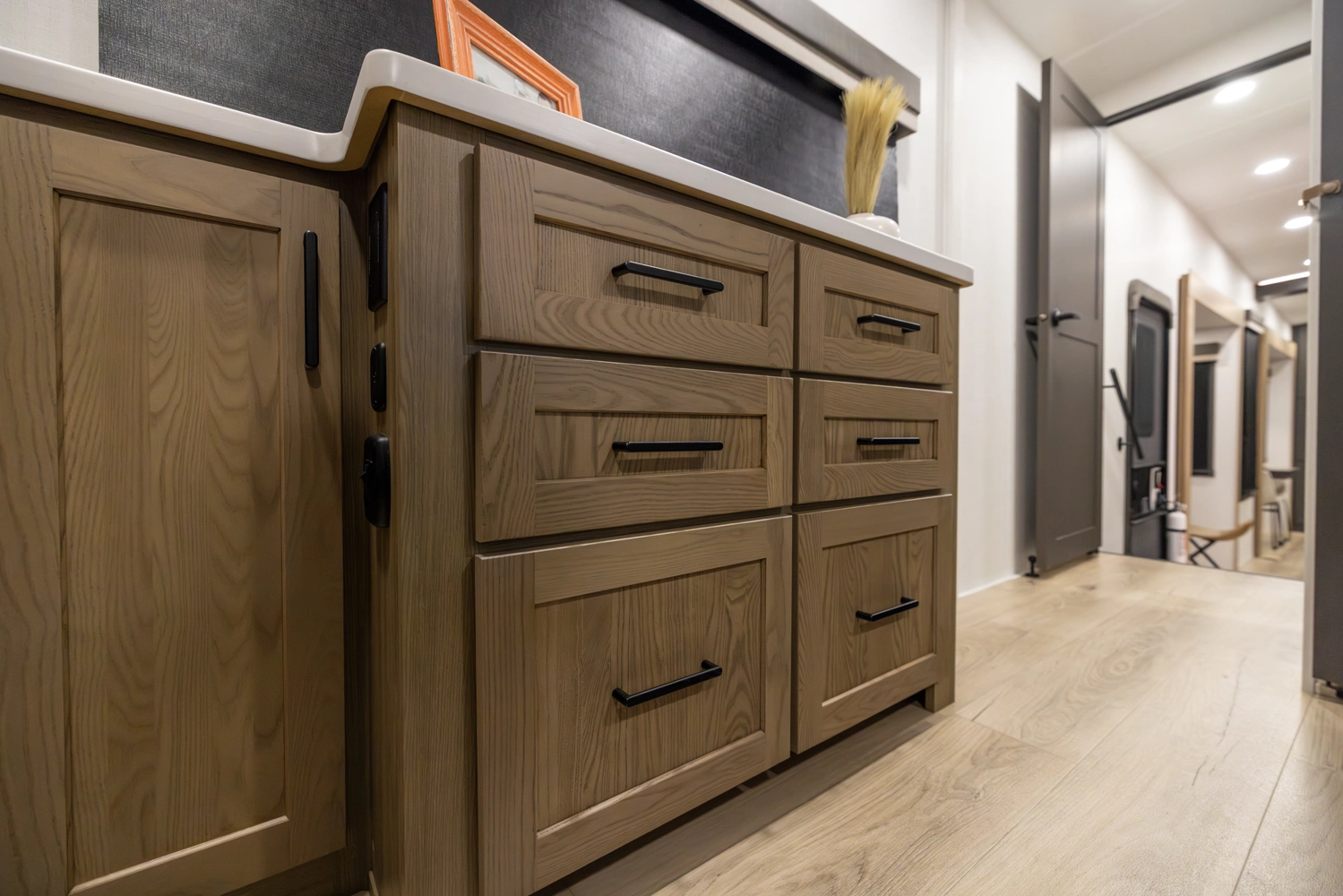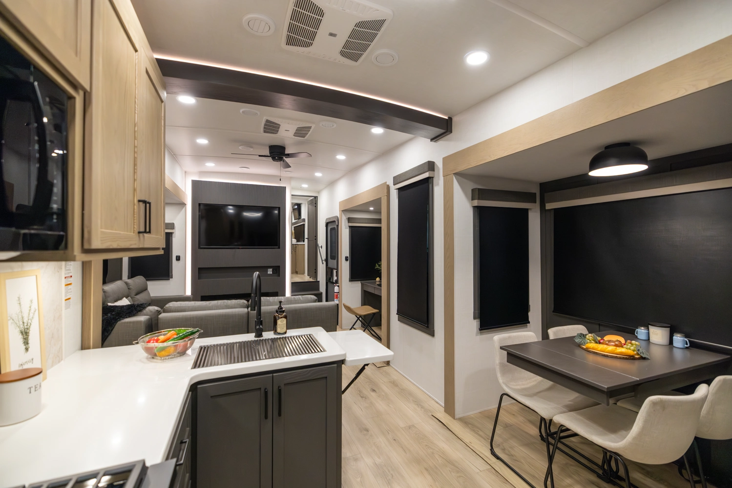 This 101" Wide Body fifth wheel is a rear kitchen layout features expansive counter space, residential style appliances, and abundant storage, making it ideal for those who love to cook while traveling. The mid living area features an L-shaped sofa with an integrated Hide-a-bed and 52" theater seat that requires no dismantling when the slides are retracted. Up front you have a private bedroom with a king bed and generous wardrobe space that is Washer/Dryer ready!