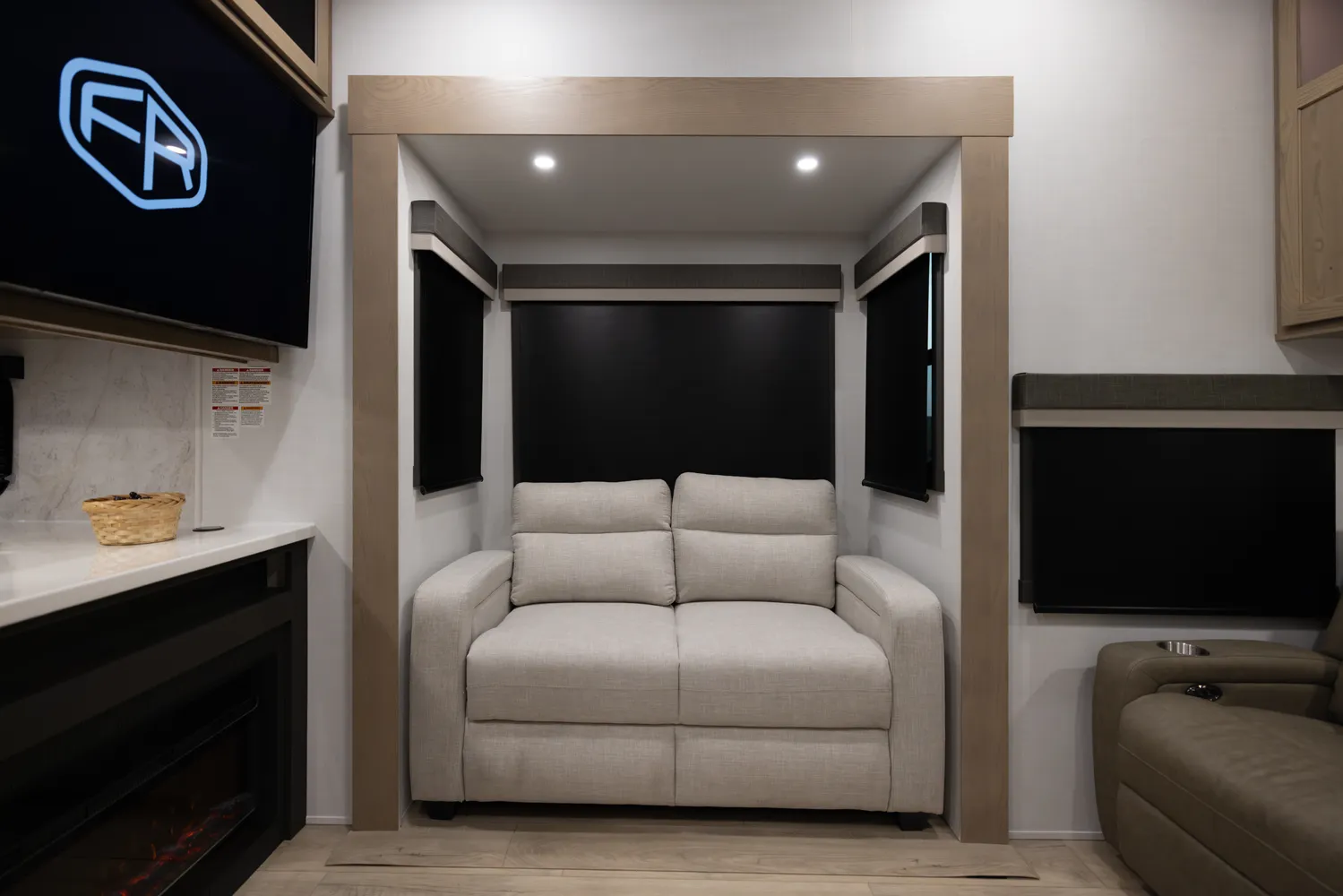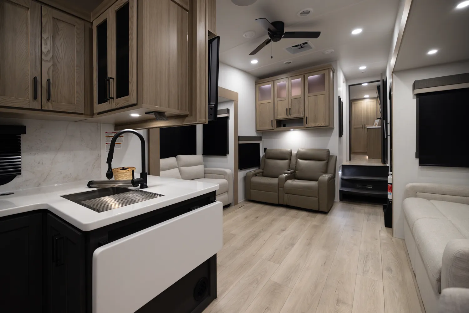 One of the best entertainment centers in the industry! This 371RK 5th wheel will entertain your family and friends for a night of relaxation after a long day of camping. It features a 68" Hide-a-Bed, a 60" Hide-a-Bed & 60" theater seating. Its front bedroom features a queen bed, (optional King) massive wardrobe storage & Washer/Dryer prep. The rear kitchen offers tons of counterspace paired with ample cabinet space, drawers, pantry storage & a trash can drawer.