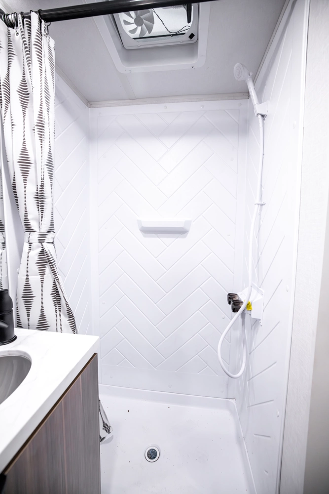 • Large 36x24 Shower Pan w/ Shower Surround + Waterproof Retractable Shower Door (No Curtain)